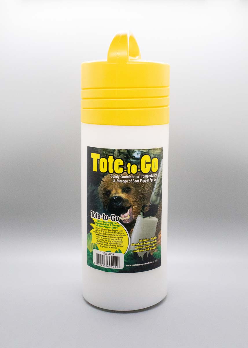 A safety container for the transportation and storage of Bear Spray. For use with either 225 or 325 gram cans, while travelling in vehicles, boats or non-commercial aircraft. Includes highly absorbent foam inserts within a heavy-duty container with handle.